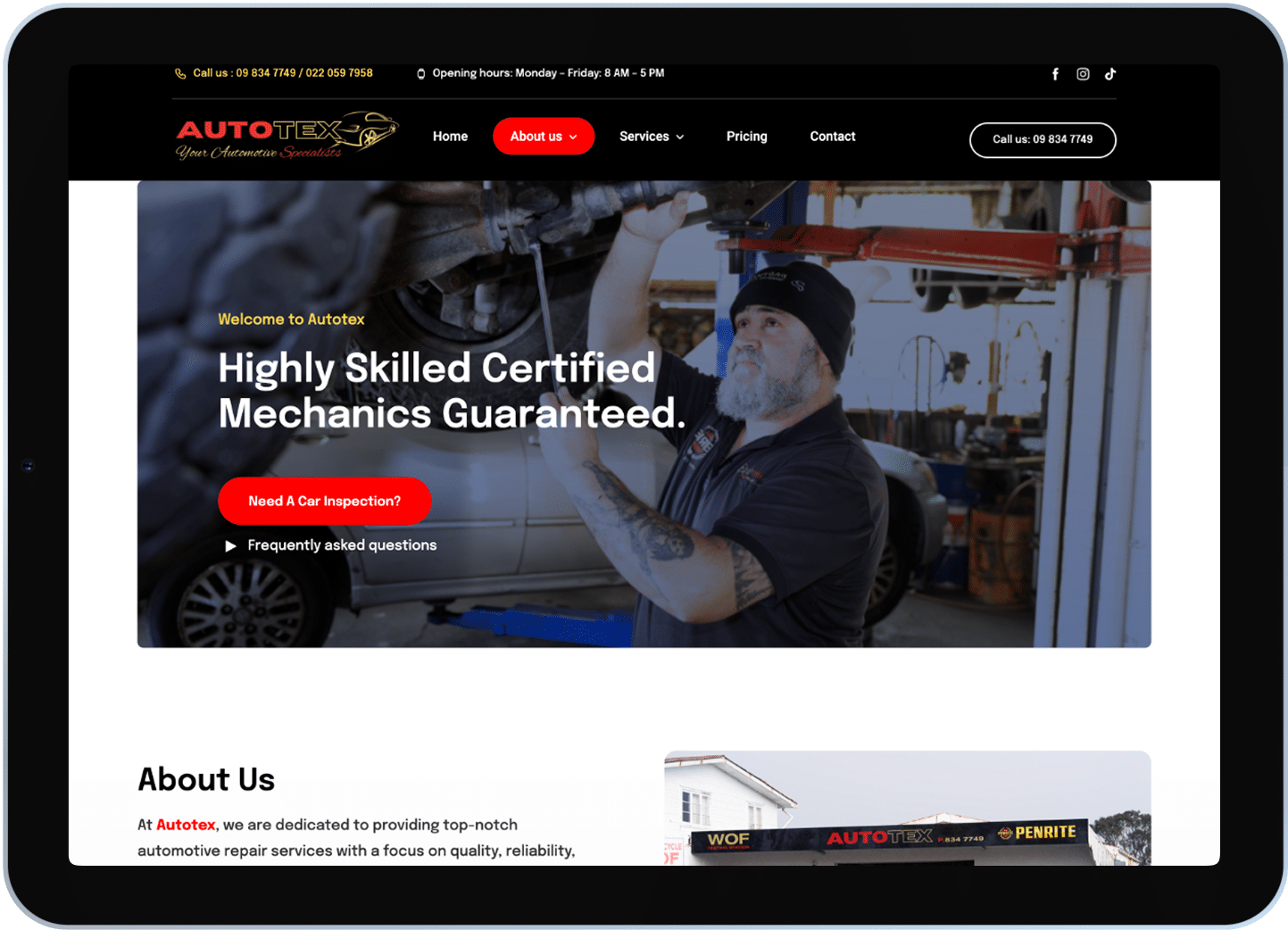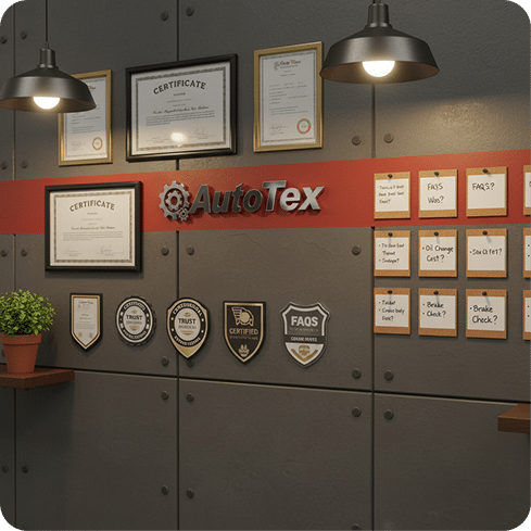 AutoTex’s old website lacked the elements that build customer confidence — there were no testimonials, certifications, or FAQs to reassure visitors of their expertise. Like an empty toolbox missing its essential tools, the site had the foundation but none of the pieces that inspire trust. Customers couldn’t find the proof they needed to choose AutoTex with confidence.