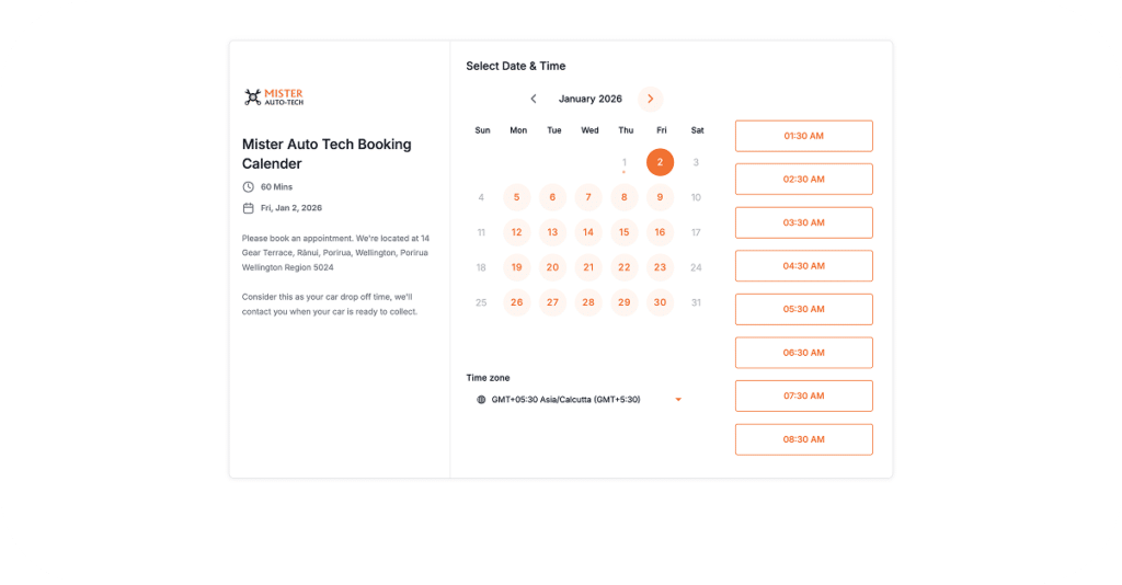 The booking page was designed to simplify appointment scheduling through a clear, step-by-step interface. Customers can easily select a date, time, and service without friction, reducing manual follow-ups and making the booking process faster and more convenient for both customers and the workshop.