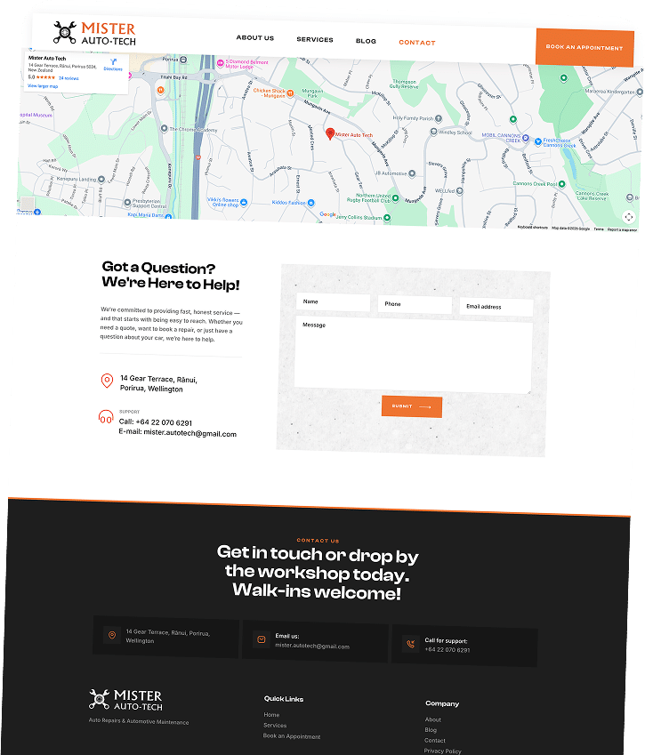 The contact page was designed to make it easy for customers to reach Mister Auto Tech through multiple touchpoints. Clear contact details, an embedded map, and a simple enquiry form work together to support quick communication, improve accessibility, and encourage direct engagement with the workshop.